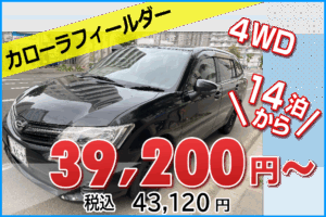 長期のご利用に無駄のないスタイルとして14泊からのプランをご用意。 観光、ビジネス、事故代車などお気軽にどうぞ。 車種はカローラフィールダー禁煙車になります。